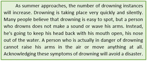 The correct answer is the third choice. The point of this passage is to explain what kind of drowning looks like. It is describing details on how to spot a drowning person.